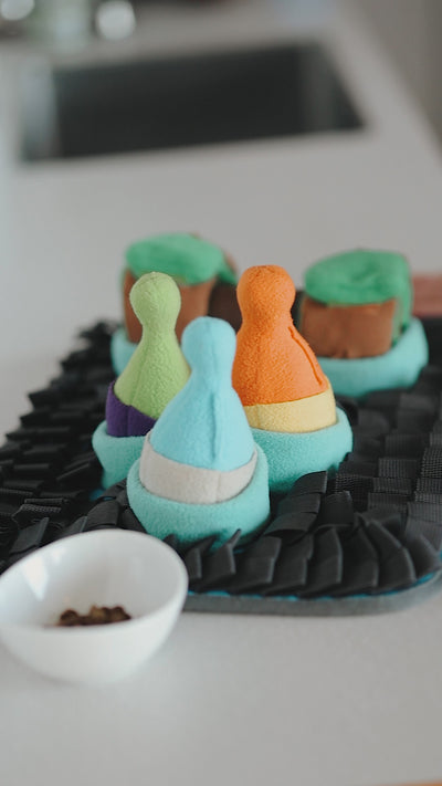 A 3-in-1 enrichment mat (50 × 38 cm) with multiple hiding zones — designed to turn snacks into calm, focused foraging.